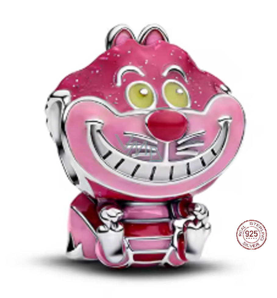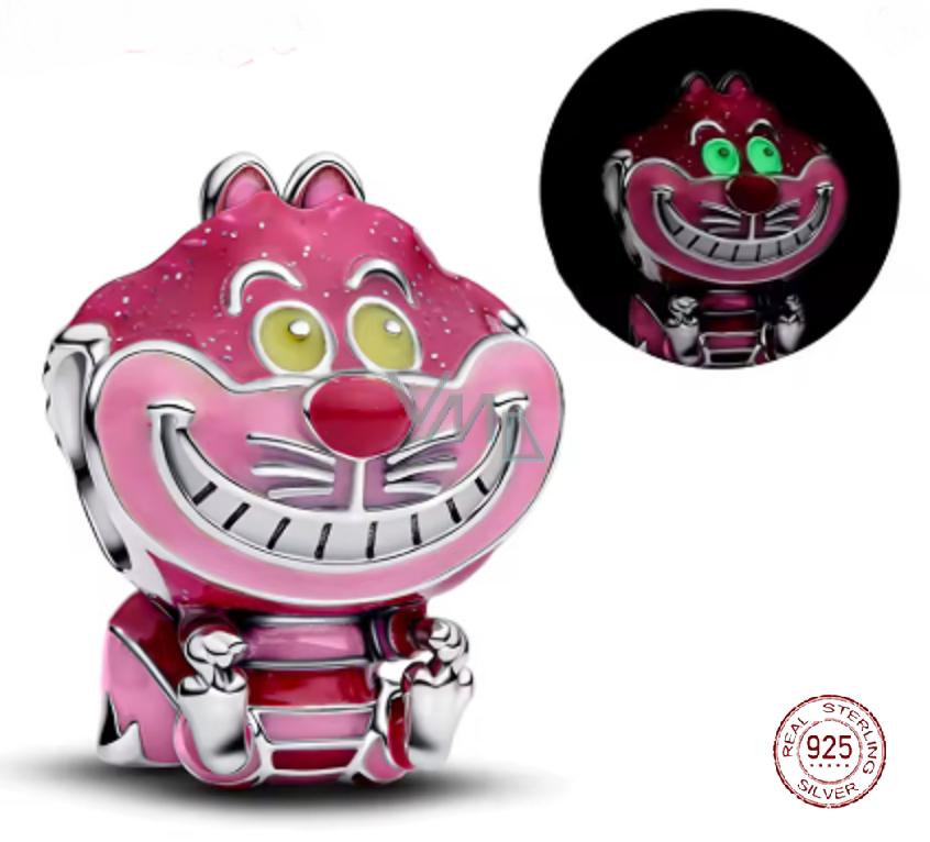 Charm Sterlingové stříbro 925 Disney Alenka v říši divů, růžová kočka s úsměvem svítí ve tmě, korálek na náramek film