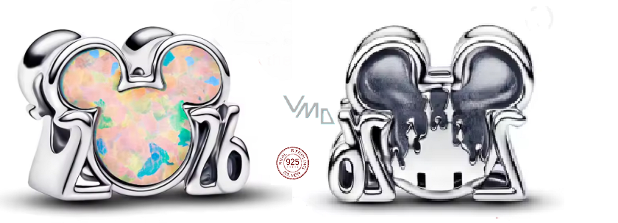 Dopřej si šperk, který spojuje kouzlo pohádek a luxusní design. Tento originální korálek ve tvaru hlavy Mickeyho Mouse je vyroben z pravého stříbra 925 a osazen Opálem, jenž hraje duhovými odlesky – od jemně růžových tónů až po modré a zelené třpytky. Rok 2026 je vyrytý na obou stranách, takže šperk zároveň působí jako pamětní edice.