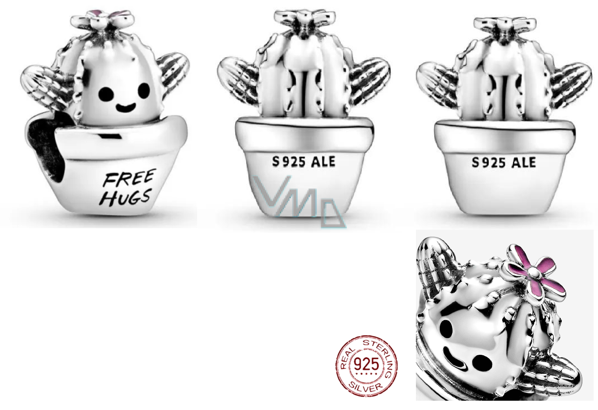 Tento roztomilý Kaktusový korálek Free Hugs - Objetí zdarma, dokazuje, že ne všechny kaktusy musí být ostré a špičaté. Tento přívěsek ze sterlingového stříbra, inspirovaný věcmi, které milujete a pro které jste nadšení, obsahuje rozkošný usměvavý kaktus v malém květináči s rytinou „Free hugs“. Má také růžový květ na temeni hlavy a texturu hrotů. Noste ji, abyste ukázali světu svou hravou stránku a jak moc rádi objímáte.