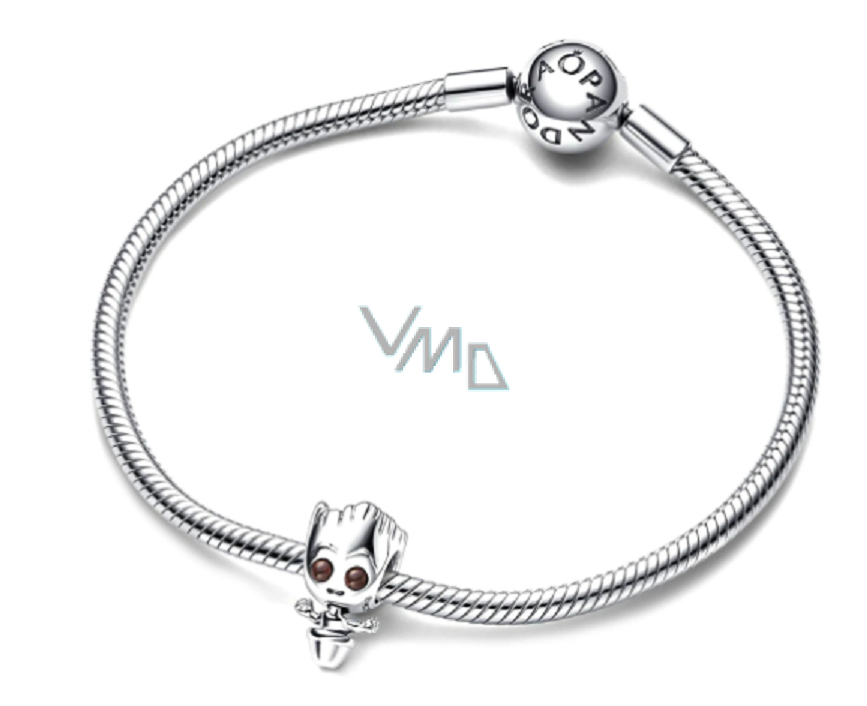"Groot, který se v květináči pohupuje ze strany na stranu, je vyroben ze sterlingového stříbra s hnědými umělými krystaly zasazenými jako oči a vroubkovanými detaily připomínajícími kůru jako vlasy a obočí. Přidejte si tento přívěsek do své sbírky jako symbol své schopnosti sílit každým dnem.