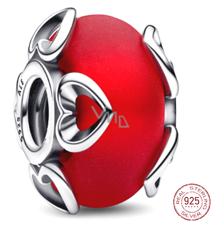 Charme Sterling Silber 925 Mattes rotes Herz mit Murano-Herzen, Liebesperle am Armband