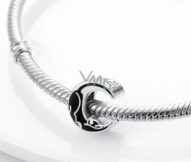 Black Cat Moon, Přívěsek 925 Sterling Silver s natahující se kočkou ve tvaru půlměsíce, navržený s hladkým černým smaltem. Na straně přívěsku je vyrytý nápis „Miluji tě na měsíc a zpět“.