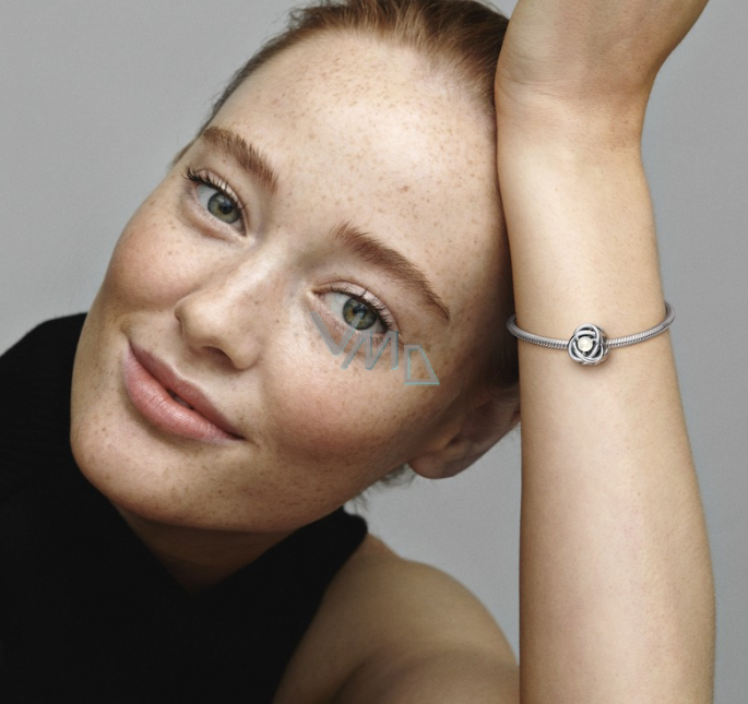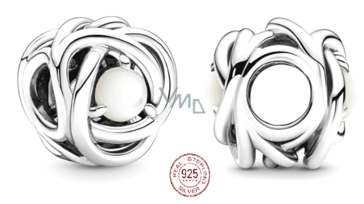 Stříbrný korálek s motivem věčnosti. Dodejte svým náramkům a přívěskům šmrnc pomocí tohoto věčného kruhu. Tento speciální kousek je vyroben ve tvaru nekonečného copu a ve svém středu je osazen bílým Perleťovým krystalem. Symbolizující věčnost, přidejte toto jiskřivé kouzlo do svého stylu, aby vaše každodenní šperky získaly jasnou aktualizaci.