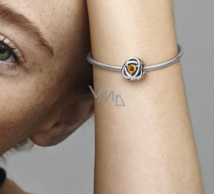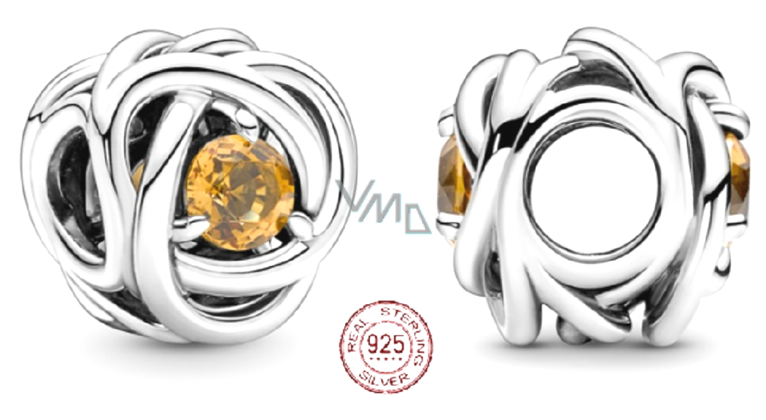 Stříbrný korálek s motivem věčnosti. Dodejte svým náramkům a přívěskům šmrnc pomocí tohoto věčného kruhu. Tento speciální kousek je vyroben ve tvaru nekonečného copu a ve svém středu je osazen medově žlutým krystalem. Symbolizující věčnost, přidejte toto jiskřivé kouzlo do svého stylu, aby vaše každodenní šperky získaly jasnou aktualizaci.