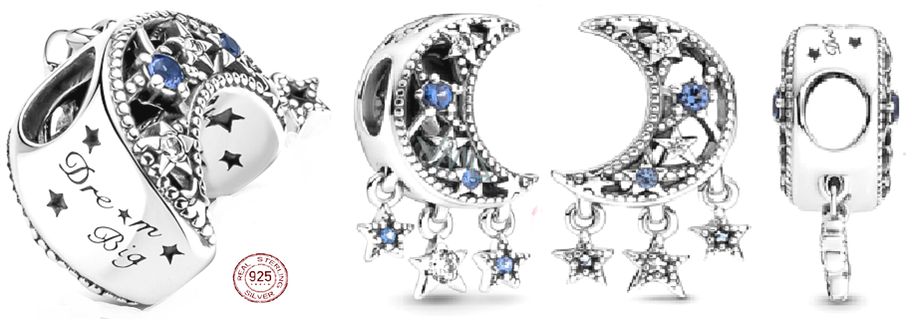 Dodejte svému vzhledu nebeský třpyt pomocí přívěsku. Krásné Hvězdy zdobené čirými a modrými kameny jsou zasazeny do prolamovaného kouzla. Tři asymetrické Hvězdy visí pod Měsícem, který je po stranách zdoben mikrokorálkem. Na straně přívěsku jsou malé vyříznuté hvězdičky roztroušené kolem vyrytého vzkazu „Dream big“ - Sni ve velkém.