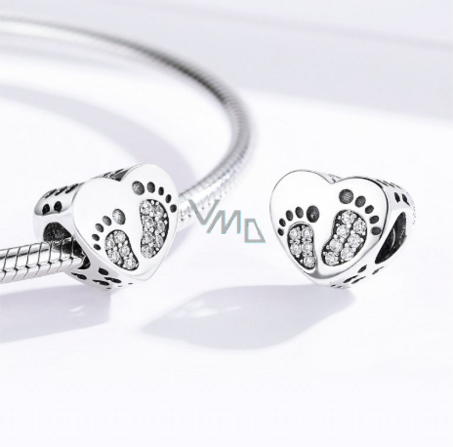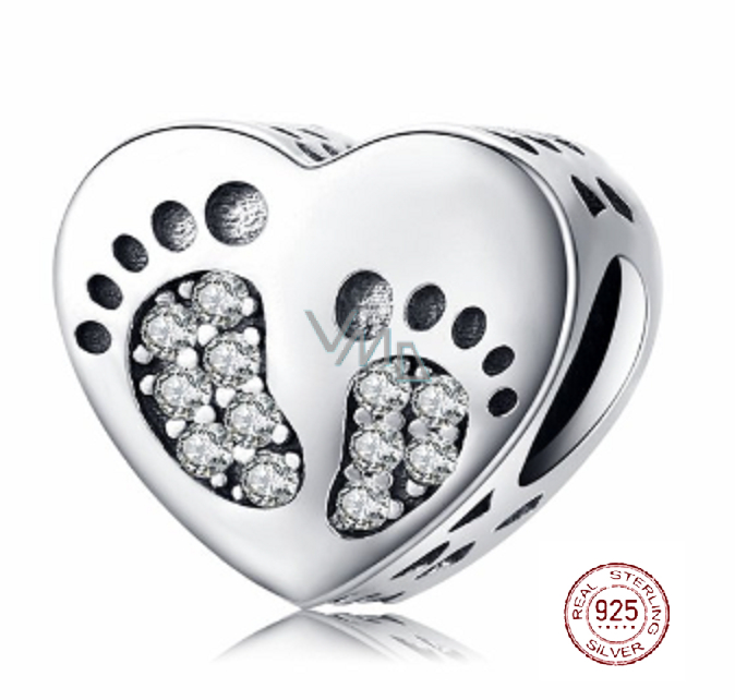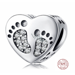 Stříbrný srdcový přívěsek v designu Otisku nožiček, má z obou stran otisky dětských nožiček, které jsou zdobené nádherně se třpytícími Zirkony čiré barvy. Originální design přívěsku, kvalitní zpracování a materiál, ručně dohotovené.