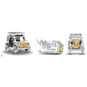 Doplňte svou touhu pomocí dvoubarevného přívěsku pro dobrodružství. Tento stříbrný přívěsek zobrazuje vůz se všemi detaily, od bočních zrcátek po kola a realistické škrábance. Rezervní pneumatika a MŘÍŽKA jemně pozlacené 14karátovým zlatem dodávají kontrast, zatímco třpytivé kameny fungují jako přední a zadní světla. Vystřižená písmena na zvednuté střeše auta hlásají „ADVENTURE“ a rytina na spodní straně vozu hlásá „ŠTĚSTÍ plánuje výlet s těmi, které MILUJETE.“ Známka letního dobrodružství na cestách.