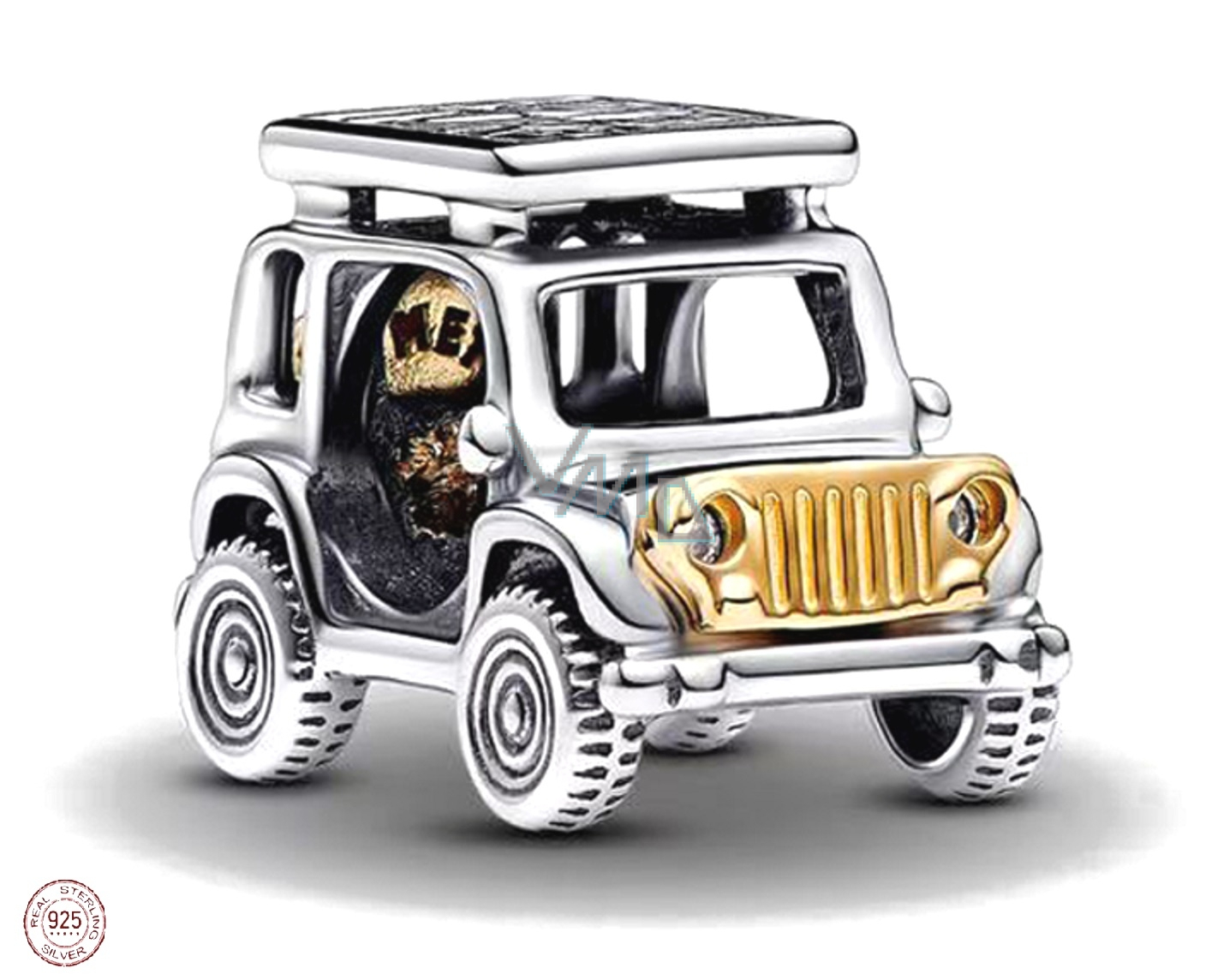 Doplňte svou touhu pomocí dvoubarevného přívěsku pro dobrodružství. Tento stříbrný přívěsek zobrazuje vůz se všemi detaily, od bočních zrcátek po kola a realistické škrábance. Rezervní pneumatika a MŘÍŽKA jemně pozlacené 14karátovým zlatem dodávají kontrast, zatímco třpytivé kameny fungují jako přední a zadní světla. Vystřižená písmena na zvednuté střeše auta hlásají „ADVENTURE“ a rytina na spodní straně vozu hlásá „ŠTĚSTÍ plánuje výlet s těmi, které MILUJETE.“ Známka letního dobrodružství na cestách.