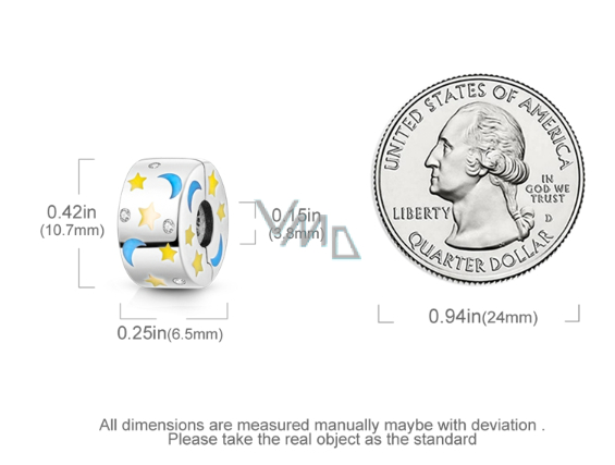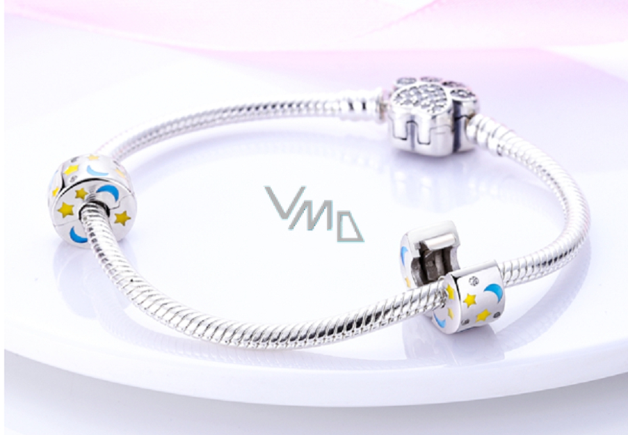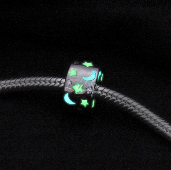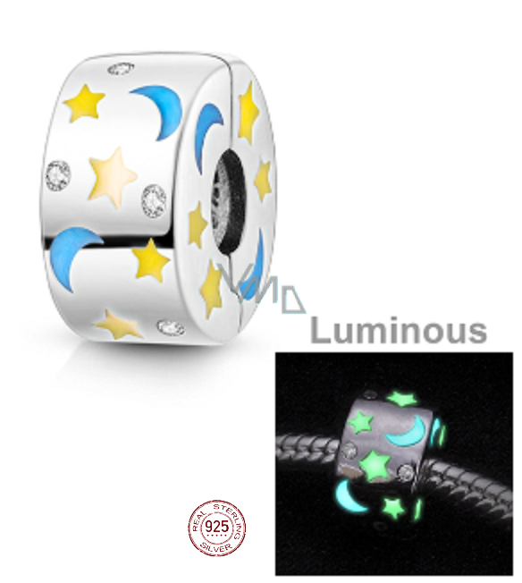 Svítí ve tmě. Přívěsek zářící ve tmě klip, korálek s malými půlměsíci a hvězdami. Navržený s hladkým modrým a žlutým smaltem a třpytivými bílými drahokamy Zirkonu. Tento stříbrný přívěsek, složitě propracovaný do posLedního detailu, znázorňuje hvězdnou oblohu, která svítí ve tmě.