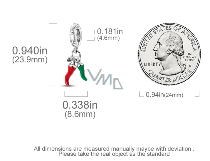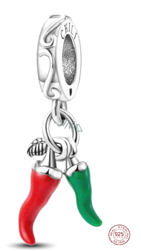 Visací přívěsek s Chilli papričkami, navržený s hladkým červeným a zeleným smaltem. Na prstenu přívěsku je vyryto slovo „chili“.