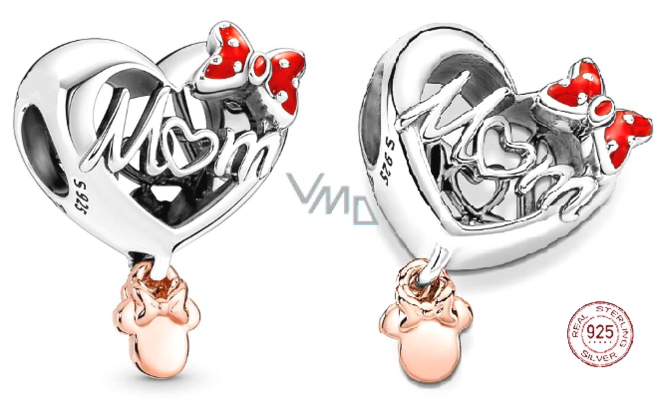 Přívěsek Disney Minnie Mouse Srdce a nápis Mum je dokonalým dárkem pro každou maminku, která je fanouškem Disneyho. Ručně vyráběný přívěsek ze stříbra s děrovaným nápisem „MUM" na jedné a „LOVE" na druhé straně má visící detail pozlacený 14karátovým růžovým zlatem. Tento šperk ve tvaru srdce má také malé červené srdíčko a mašličku s ručně naneseným smaltem.