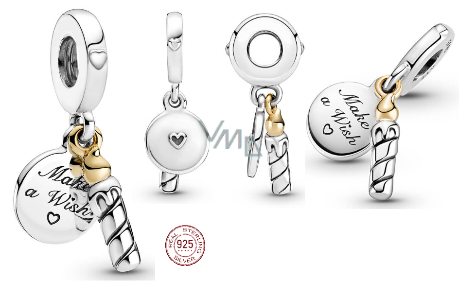 Hravý korálek vyrobený ze sterlingového stříbra, ve tvaru narozeninové svíčky, jejiž knot je vyrobený ze speciálního materiálu, "Pandora Shine" - jedná se o slitinu stříbra a mědi, která je pozlacená 18ti karátovým žlutým zlatem, kruhový přívěsek dekorovaný nápisem ''Make a wish'' - Přej si něco.