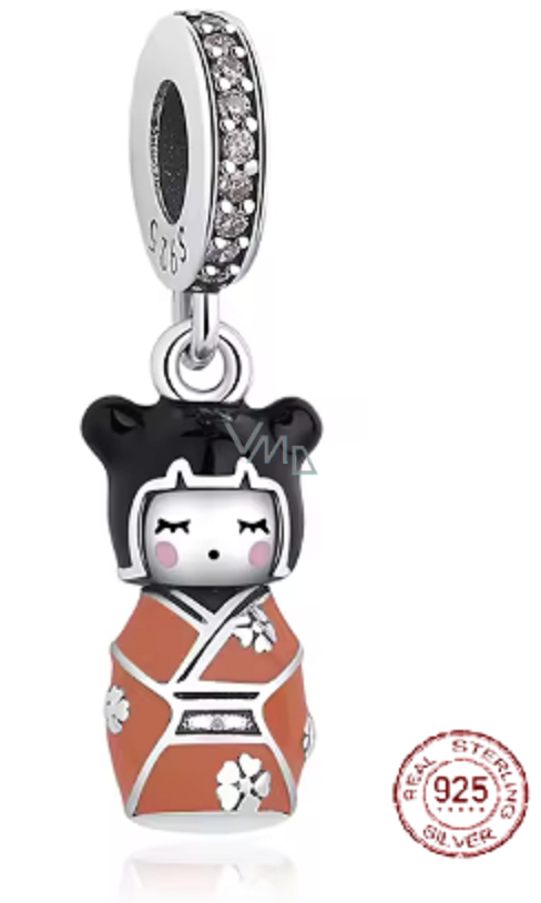 Charm Sterlingové stříbro 925 Japonská panenka Kokeshi v hnědo-oranžovém kimonu - japonská elegance, přívěsek na náramek cestování