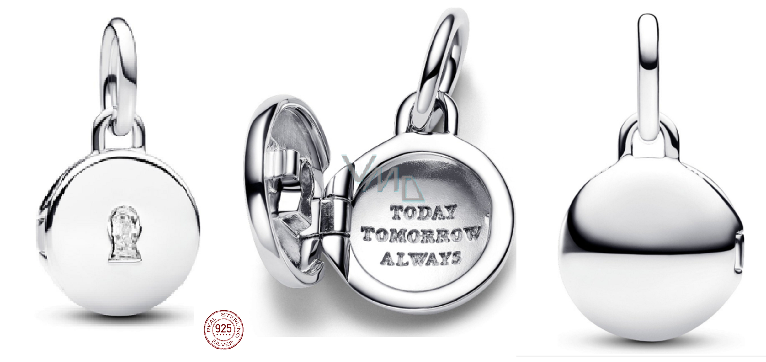 Mějte to, co je vám nejdražší, blízko k vašemu srdci s otevíratelným a gravírovatelným přívěskem. Tento přívěsek ze sterlingového stříbra má na přední straně čirý kámen kubické zirkonie ve tvaru klíčové dírky a bezpečně se otevírá a zavírá, takže uvnitř můžete mít malý obrázek, poznámku nebo pramen vlasů. Uvnitř medailonu je vyryto sdělení „DNES ZÍTRA VŽDY“ a zadní strana je prázdná pro vlastní rytinu. Noste jej na náhrdelníku nebo náramku, jako symbol udržování vaší lásky v bezpečí a připomínku, abyste si ji vážili každý den.
