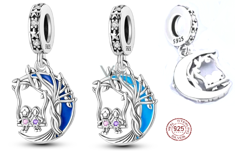 Přívěsek ze sterlingového stříbra 925 zářící ve tmě s prolamovaným designem, se stromem a dvěma sestrami na houpačce pod půlMěsícem. Navrženo s hladkým modrým smaltem a jiskřivými růžovými, fialovými a bílými drahokamy Zirkonu. Na prstenu kouzla jsou kolem dokola malé hvězdičky. Strom symbolizuje rodinné spojení a kruh života.