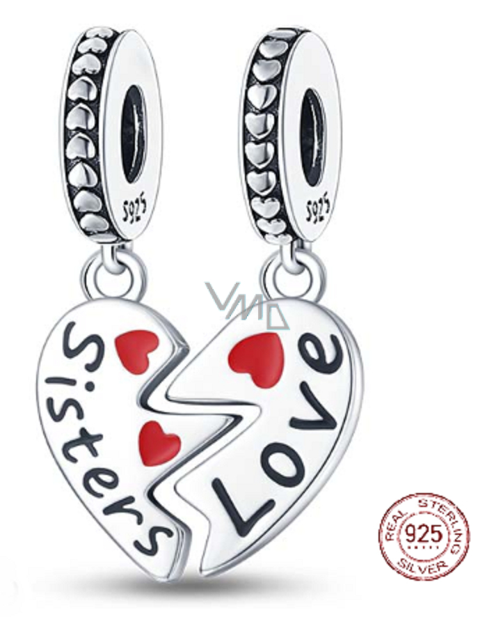 Přívěsek vyrobený ze stříbra, zdobený červeným a černým smaltem. Přívěsek srdce je uprostřed rozdělitelný, skládá se ze dvou rozdělitelných přívěsků zdobený dvěma přívěsky, na jednom z nich najdete nápis "Sisters" na druhém "Love". Sestry sdílejí vzpomínky z dětství a dospělé sny. A nyní mohou sdílet přívěsek. Tento stříbrný přívěsek je trvalou poctou sesterství. Sestry, ne vždy se vidíte, ale vždy jste tu pro sebe.“ Ukažte svou lásku ke spojení, které sdílíte, a noste smysluplný kousek na náramku, nebo jako přívěsek na náhrdelníku, nebo jej darujte své sestře, abyste jí ukázali, že ji znáte.