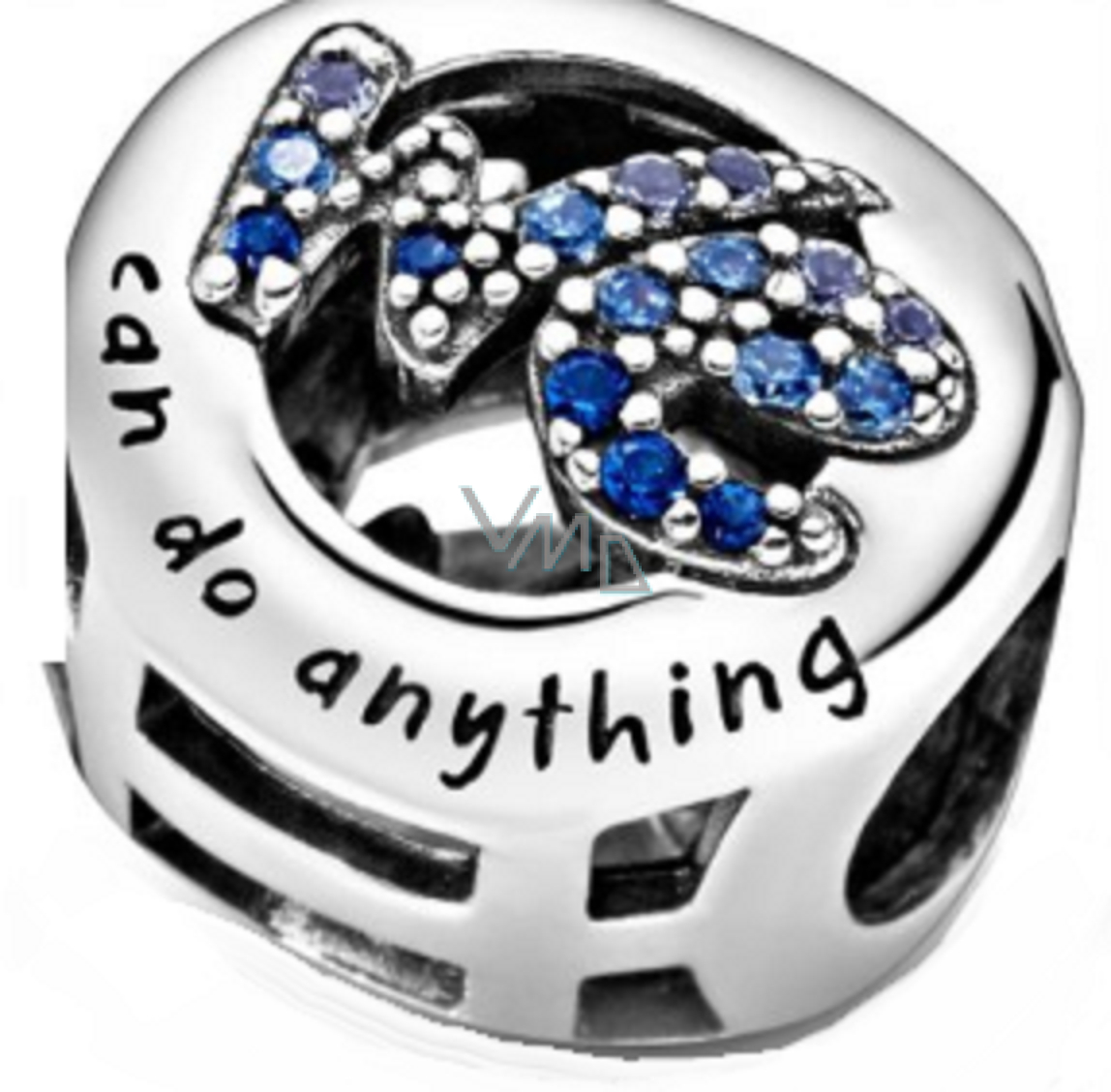 Korálek ze sterlingového stříbra 925 obsahuje třpytivé modré kameny s názvy „we (my) a me (vy)“ . Na každé straně tohoto hladkého Stříbrného prolamovaného kouzla je vyryta kompletní zpráva a v překladu zní: „můžeme udělat cokoliv“ na jedné straně a „síla je ve mně“ na straně druhé.