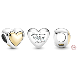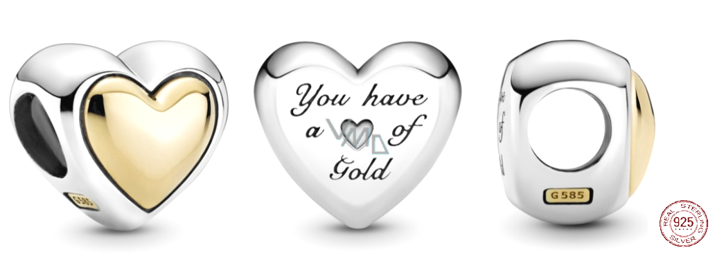 Krásný korálek ve tvaru Stříbrného srdce, v jehož středu je srdce. Ze zadní strany přívěsku je rytina "You have a heart of gold" - Máš srdce ze zlata. S tímto korálkem určitě nešlápnete vedle a Vaše milovaná si ráda rozšíří svou sbírku korálků.