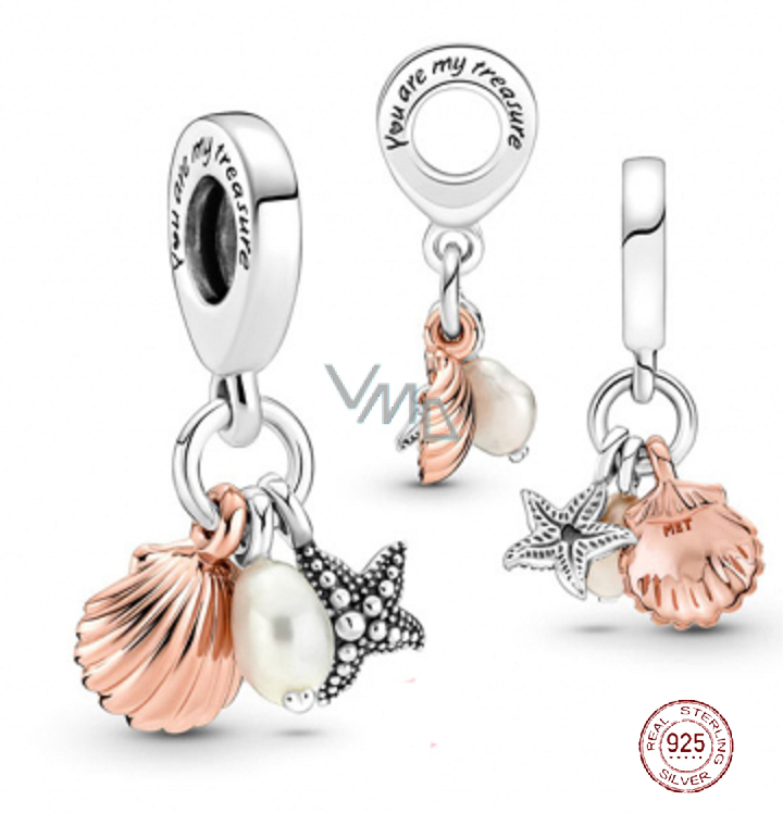 Tento trojitý přívěsek je inspirován jedinečnou krásou každé mušle a Perly v oceánu a představuje trojici mořských pokladů, které přenesou pláž na váš náramek. Z očka visí hvězdice ze sterlingového stříbra s vyvýšenými mikro kuličkami, upravená kultivovaná sladkovodní perla a Lastura jemně pozlacená růžovým zlatem a s realisticky vyrytými detaily. Na straně očka je vzkaz „You are my treasure“. - Jsi můj poklad