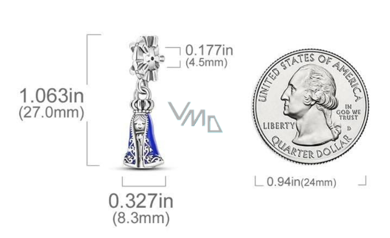 Visací přívěsek Blahoslavené panny Marie Nossa Senhora Aparecida z ryzího stříbra 925, nosený pro duchovní vedení a ochranu. Navrženo s bílými třpytivými drahokamy Zirkonu a hladkým modrým smaltem - smaltovaným županem a korálkovou korunou.