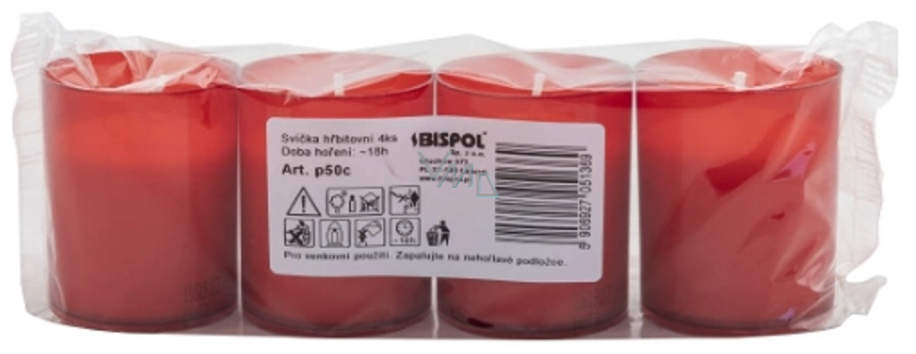 Bispol hřbitovní svíčka bez víčka červená 4 x 50 g 18 hodin 4 kusy