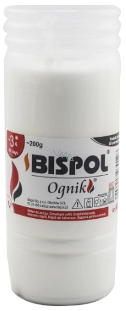 Kvalitní olejová svíčka Bispol Ognik je vhodná především jako náplň do hřbitovních skel. Díky preciznímu lití a kvalitnímu parafínu 100 % vyhoří a poskytne dlouhotrvající plamen.