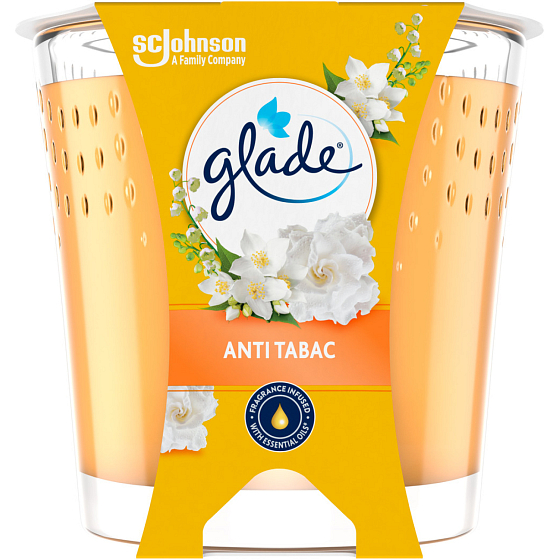 Parfümierte Duftkerze Glade mit dem Duft weißer Blumen schafft eine entspannende Atmosphäre in jedem Interieur. Das massive Glas dient auch als geschmackvolle Dekoration.