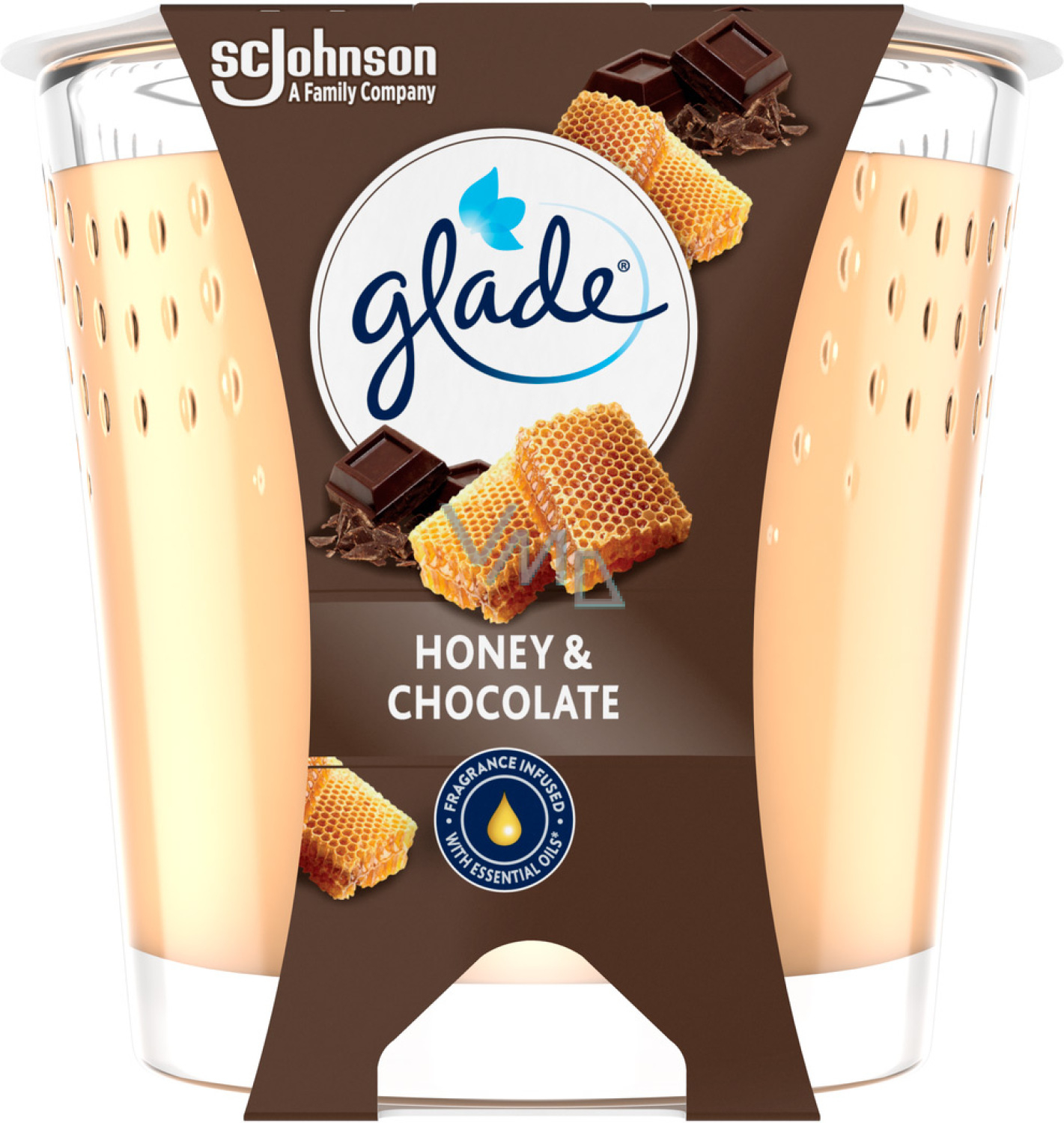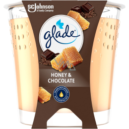 Parfümierte Duftkerze Glade mit dem Duft von Honig und Schokolade schafft eine entspannende Atmosphäre in jedem Raum. Das massive Glas dient auch als geschmackvolle Dekoration.