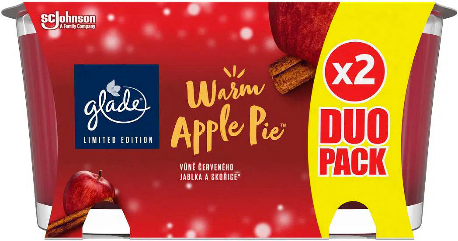 Parfümierte Duftkerze Glade mit dem Duft von rotem Apfel und Zimt schafft eine entspannende Atmosphäre in jedem Interieur. Das massive Glas dient auch als stilvolle Dekoration.