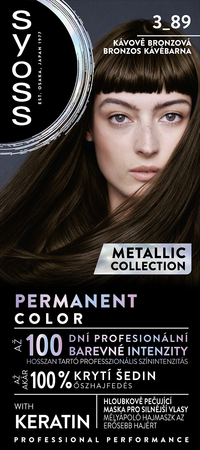 Die metallische Reihe der permanenten Farben von Syoss für einen strahlend metallischen Look, der durch den tiefenpflegenden Balsam mit Intense Plex Technologie Millionen von Haarbindungen regeneriert. Für professionelle Ergebnisse entwickelt.