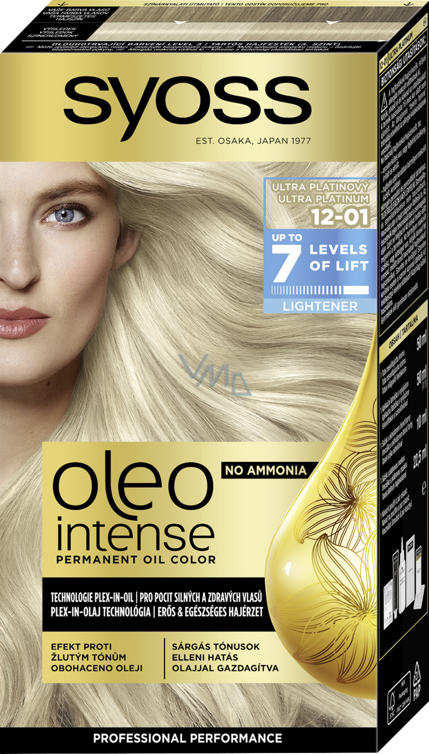 Syoss Oleo Intense – ölverstärktes, langanhaltendes Färben ohne Ammoniak für ein Gefühl von starken und gesunden Haaren. Die pflegende Formel hilft den Farbpigmenten, tief in die Haarfasern einzudringen, für eine satte, langanhaltende Farbe und hellt Ihr Haar um bis zu 7 Nuancen auf. Die pflegende Maske mit PLEX-Technologie, angereichert mit einer Mischung aus 4 japanischen Ölen, umhüllt nach dem Färbeprozess die Haarfasern wie einen Schild, erneuert die Stärke der Haare und verbessert die Textur. Außerdem hilft sie, kupferne Töne zu neutralisieren für einen klaren, kühlen und strahlenden Blondton und hinterlässt Ihr Haar samtig weich und voller luxuriösem Glanz.