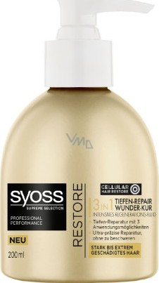 Syoss Supreme Restore. Tato skvělá řada je určena pro poškozené či extrémně poškozené vlasy. Důkladně napravuje poškození vlasů a hloubkově je regeneruje až na buněčné úrovni. Intenzivní kúra pro ultra intenzivní hluboce účinnou regeneraci. Poškozené vlasy napravuje s vysokou přesností a intenzivně je regeneruje. Tento výrobek lze použít třemi způsoby, díky čemuž je dokonalým pečujícím přípravkem pro vážně poškozené vlasy.