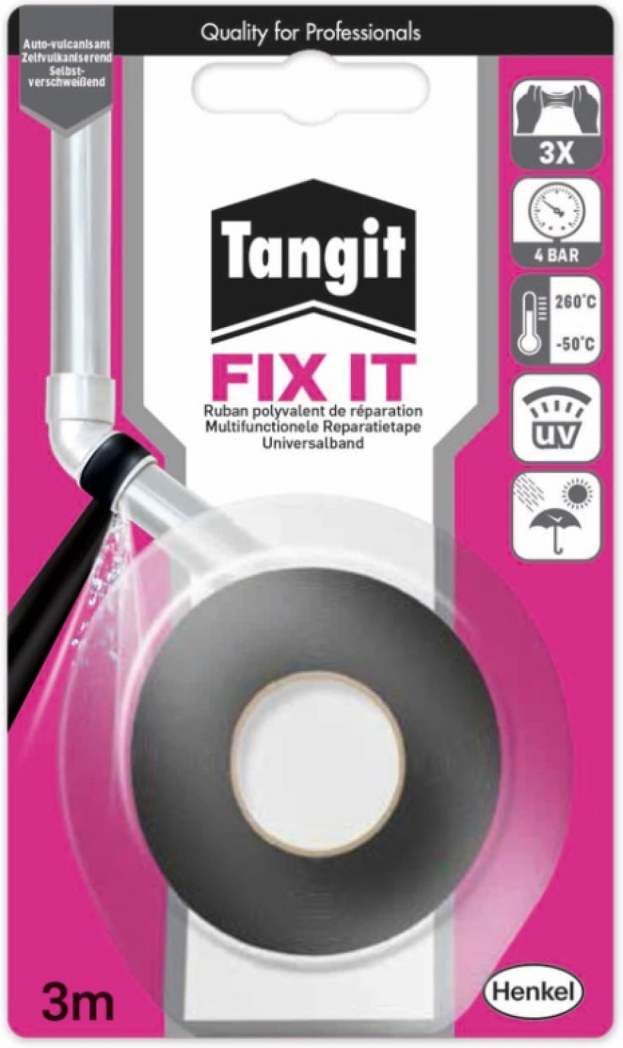 TANGIT Fix It ist ein universelles Silikon-Dichtungsklebeband, das sofort Leckagen und Undichtigkeiten im Haushalt, in der Werkstatt und im Freien behebt. Dank der selbstvulkanisierenden Technologie verbindet sich das Band fest mit sich selbst, ohne dass Klebstoffe oder Werkzeuge benötigt werden, und bildet so eine flexible, wasserdichte und hitzebeständige Ummantelung um den beschädigten Bereich.