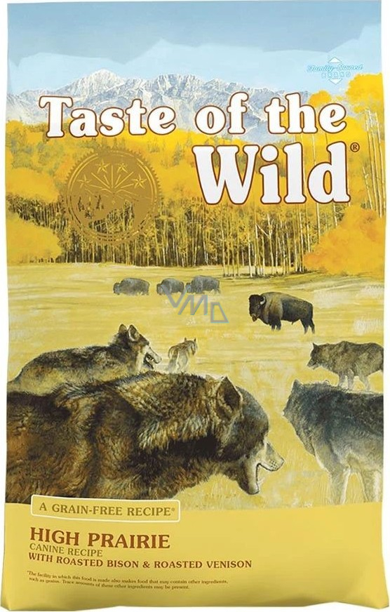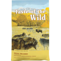 Kompletní vyvážená potrava pro psy Taste of the Wild High Prairie Canine s pečeným bizonem a dalšími druhy volně žijících zvířat prérie, srnčím, jehněčím a hovězím je určeno dospělým zvířatům všech plemen. Díky obsahu mastných kyselin pomáhají granule Taste of the Wild High Prairie Canine udržovat zdravou a lesklou srst. Strava je bohatá na probiotika, která podporují obranyschopnost organizmu a zdravé trávení. Se sušeným kořenem čekanky, antioxidanty, rybím masem a vůní divokých bylin. Taste of the Wild High Prairie Canine s pečeným masem z bizona a dalších zvířat skvěle chutná a je tou pravou potravou pro vaší milovanou šelmu.