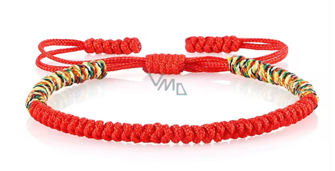Ručně vyráběný tibetský buddhistický náramek, náramkem pro štěstí pro ženy i muže. Splétaný provazový s červenou nití.