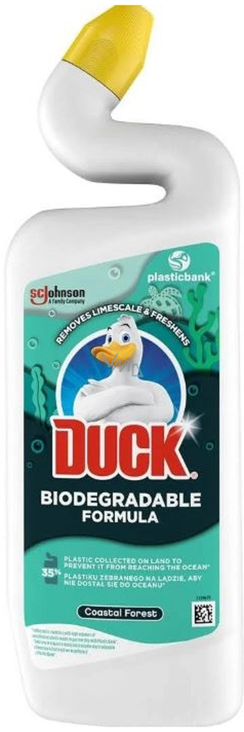Duck WC Coastal Forest tekutý čistič dodá vaší toaletě dokonalou svěžest. . Lepší dosah pod obrubou WC mísy díky unikátnímu hrdlu výrobku. Jeho biologicky odbouratelné složení představuje velké plus pro naši přírodu. Tento tekutý gel se postará o celkovou hygienu vašeho WC, odstraní vodní kámen, a dokonce i odolné skvrny. Unikátní tvar hrdla lahve vám umožní lépe dosáhnout pod okraj. WC čistič DUCK Coastal Forest dodá vaší toaletě dlouhotrvající vůni. Láhev je z 35 % vyrobena z plastu posbíraného na pevnině a dá se celá recyklovat.