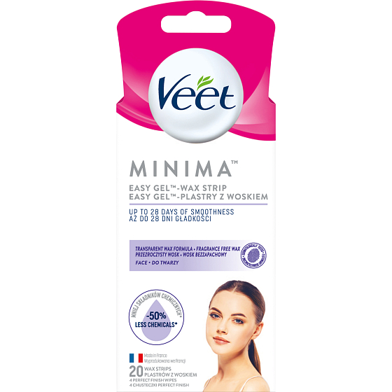 Veet Minima Easy-Gel™ Wachsstrips für das Gesicht im Vergleich zur vorherigen Zusammensetzung 50% weniger Chemikalien und hypoallergene Zusammensetzung. Die Wachsstrips sind durchsichtig und geruchlos.