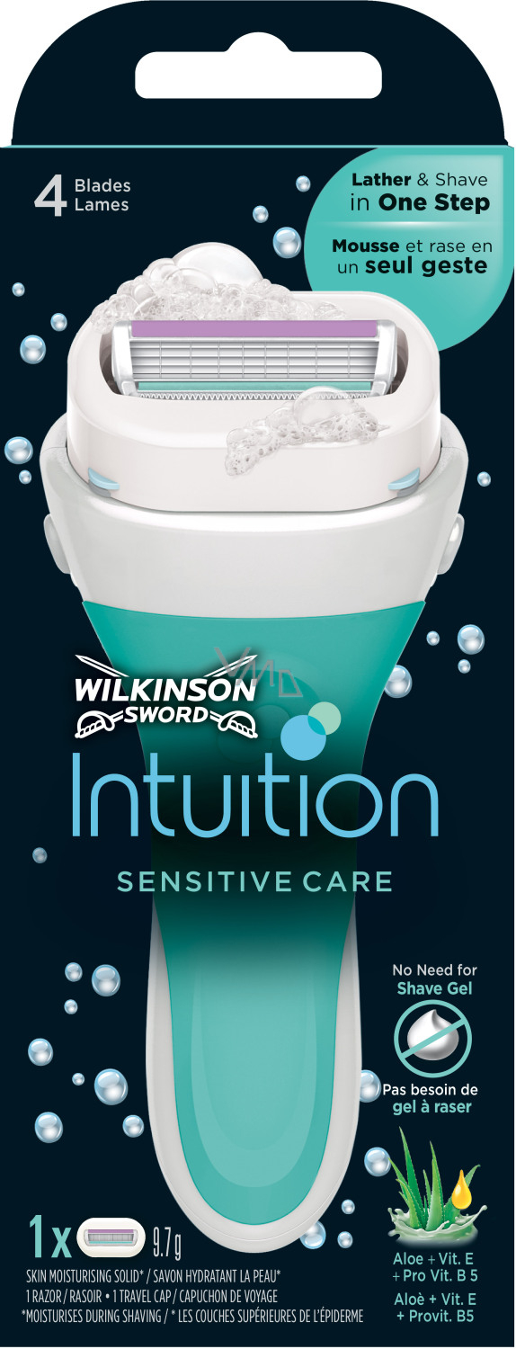 Dank des seifigen Pflegefilms benötigen Sie keine Rasiercreme oder -gel mehr. Der Wilkinson Sword Intuition Sensitive Care rasiert, schäumt und hydratisiert Ihre Haut in einem einfachen Schritt und spart Ihnen Zeit und Geld.