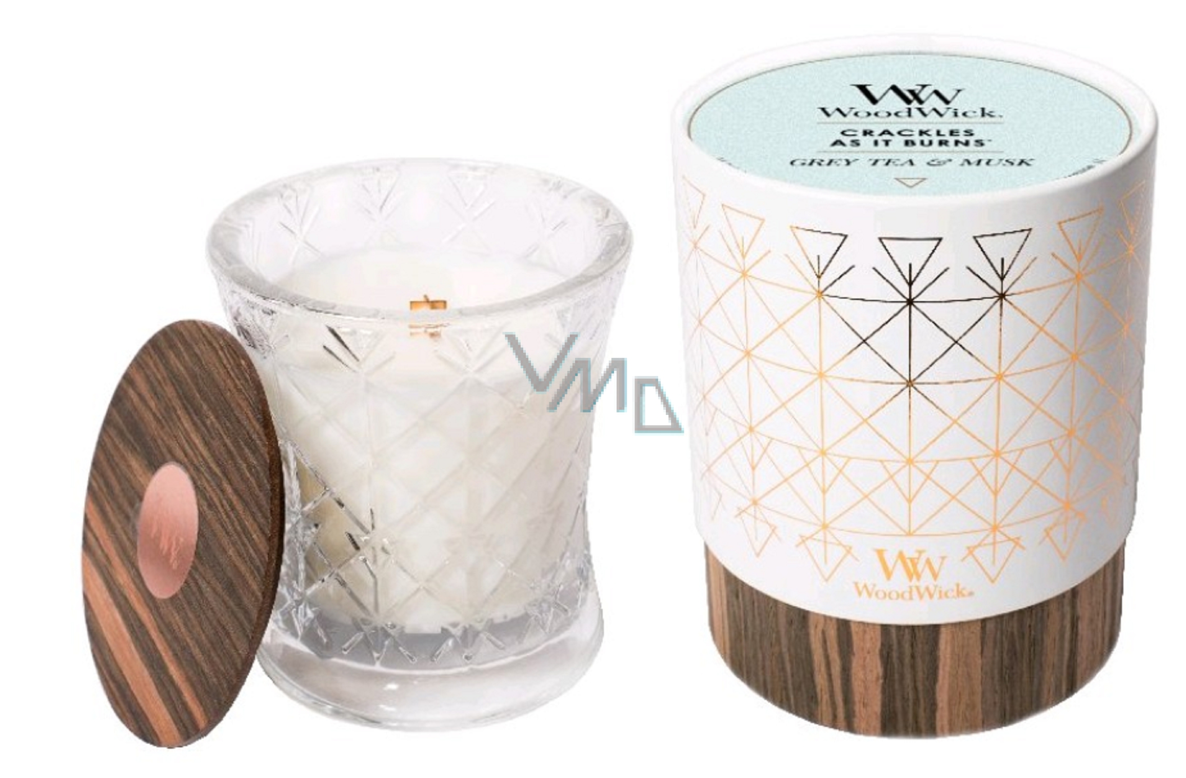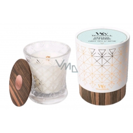 Designově propracovaná svíčka v oválné skleněné váze z ručně foukaného čirého skla dekorována mohutným dřevěným víčkem s pryží po obvodu, která zabraňuje vyprchávání vůně. Dřevěné víčko poslouží jako podstavec pod svíčku při jejím hoření a chrání tak povrch nábytku.