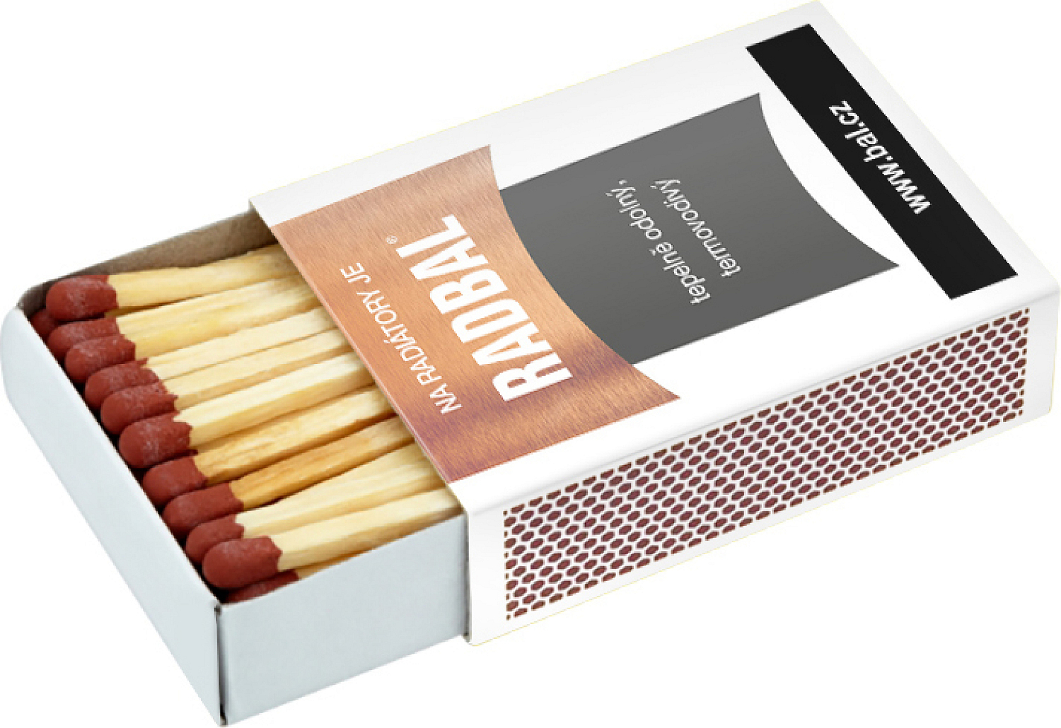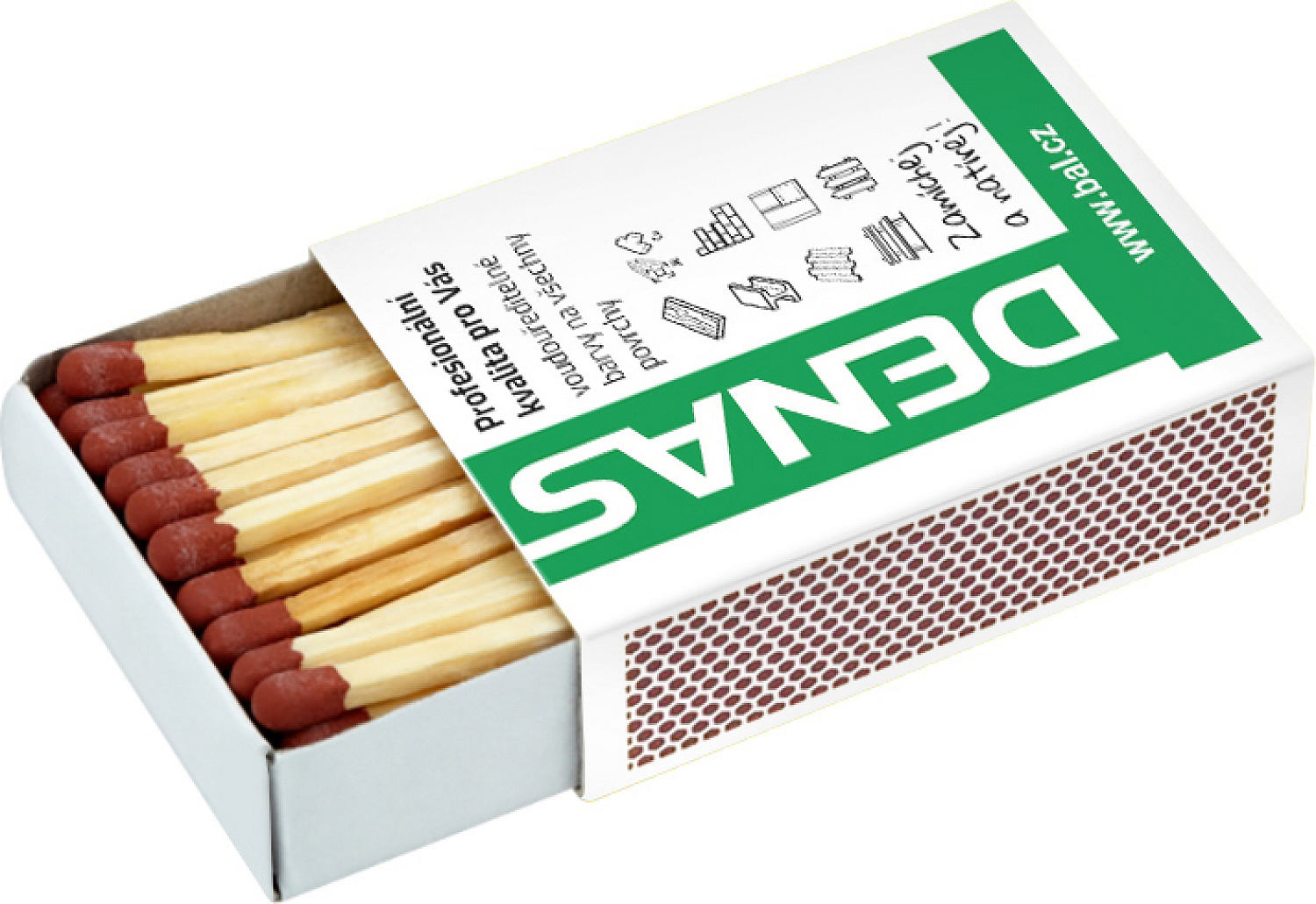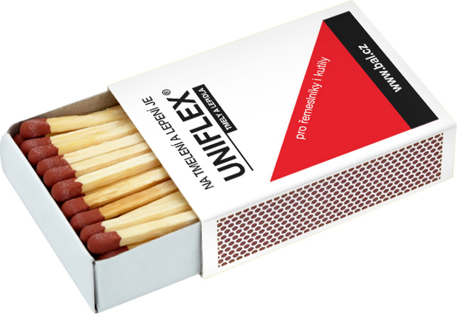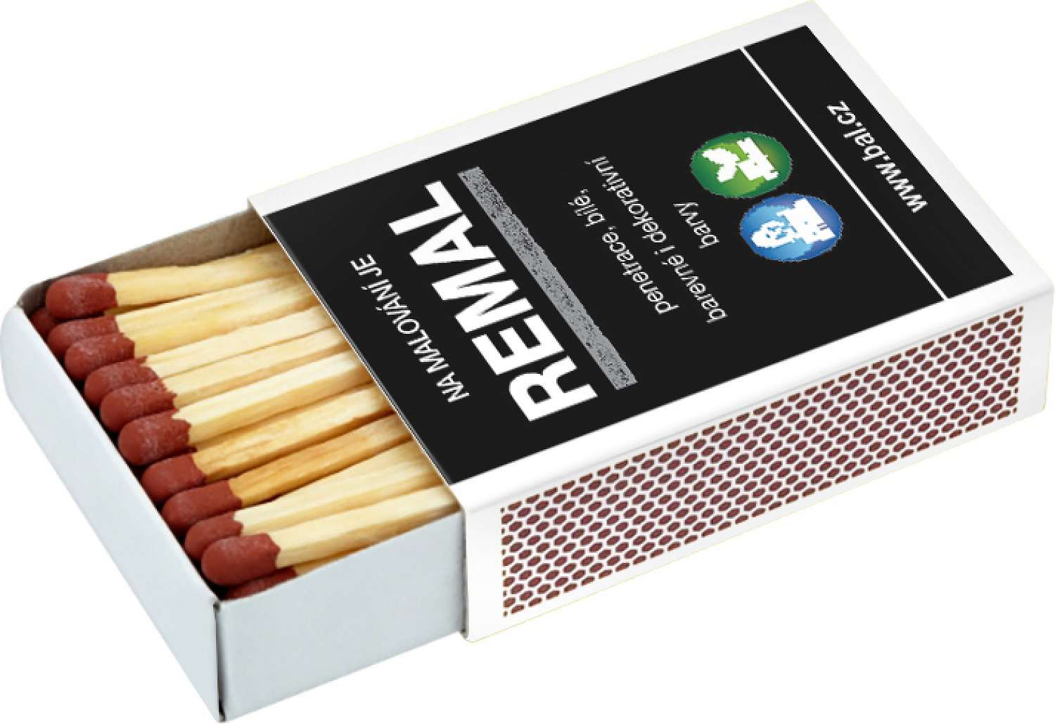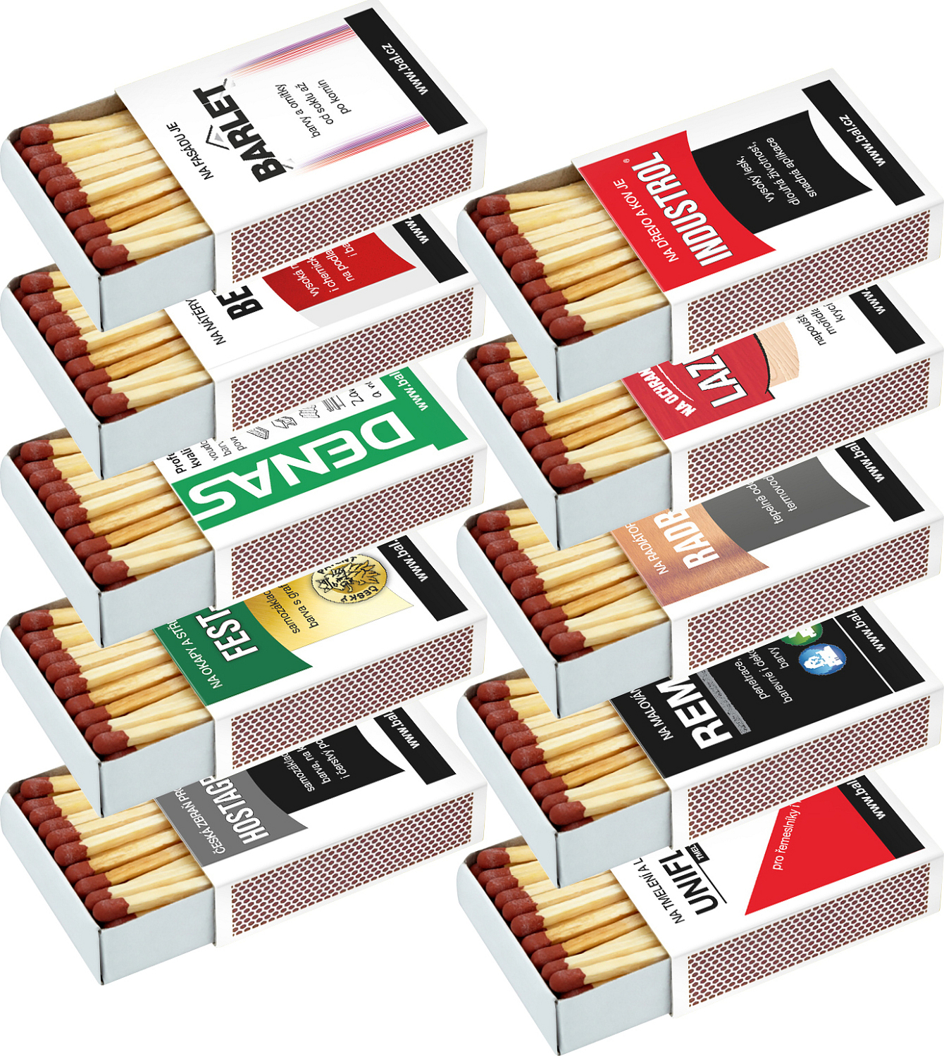 Zündhölzer sind ebenfalls hölzerne Stäbchen mit entzündlicher Substanz am Ende des Stäbchens, das durch Reibung Feuer fängt. Zündhölzer mit dem Motiv BARVY A LAKY HOSTIVAŘ.