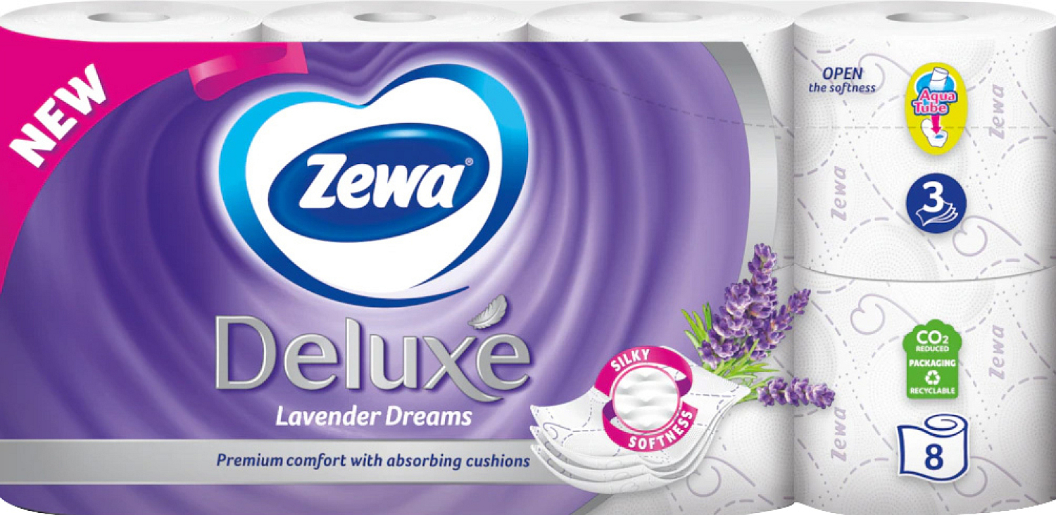Verwandeln Sie Ihr Badezimmer in eine beruhigende Entspannungszone. Das 3-lagige Toilettenpapier Zewa Deluxe Lavendelträume verwöhnt Ihre Sinne mit dem aromatischen Duft frischer Lavendel. Darüber hinaus bietet Ihnen das Papier eine sanfte Berührung für Ihre Haut. Das geprägte Zewa-Logo garantiert Ihnen erneut unsere berühmte Qualität. Die Deluxe-Reihe wird aus recyceltem Papier hergestellt.